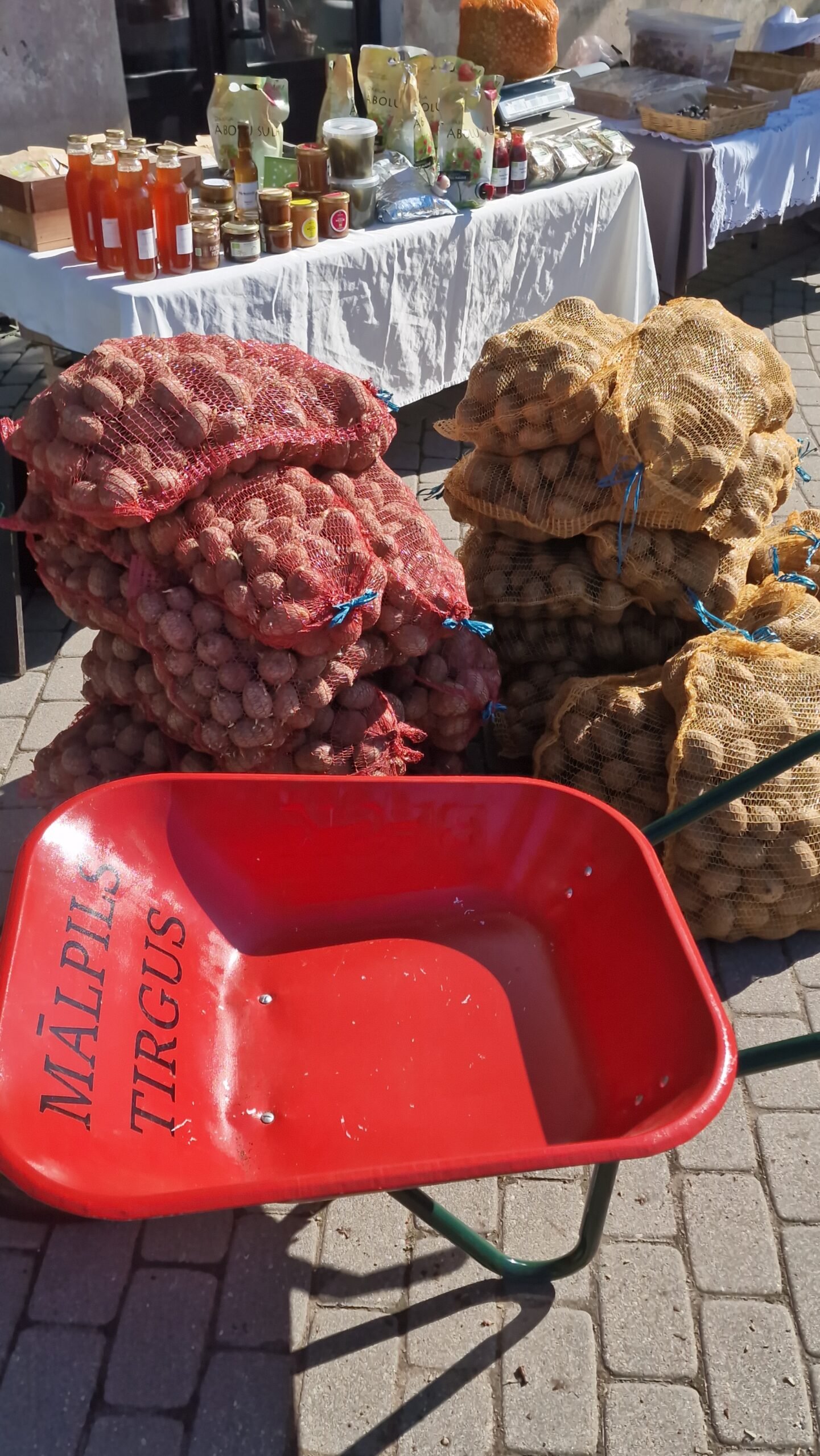 Tirgū iespējams sastapt gan svaigi ceptu maizi, kūpinātu vistu un mājas olas, gan biezpienu, sierus, zivis, sezonas dārzeņus un augļus, medu, meža veltes, stādus, Mālpilī grauzdētu kafiju, piparkūkas, ogu sukādes, sulas un citus našķus. Piedāvājumu papildina amatniecības darbi – adījumi, keramika, koka izstrādājumi un citi meistaru roku darinājumi. Šis daudzveidīgais klāsts tiek lolots jau trešo gadu, un tas kļuvis par neatņemamu Mālpils dzīves sastāvdaļu.